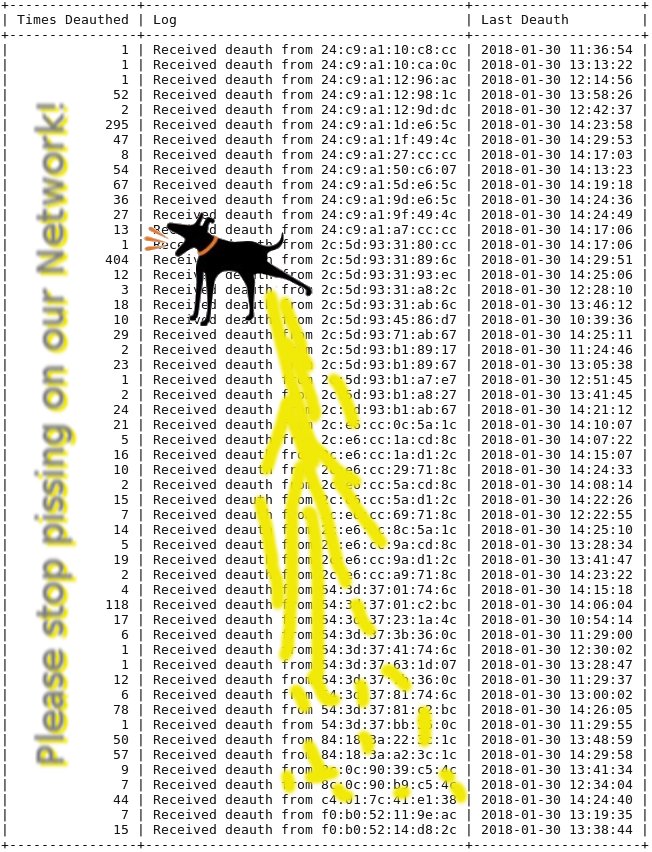 +----------------+----------------------------------------+---------------------+ | Times Deauthed | Log | Last Deauth | +----------------+----------------------------------------+---------------------+ | 1 | Received deauth from 24:c9:a1:12:96:ac | 2018-01-30 12:14:56 | | 60 | Received deauth from 24:c9:a1:12:98:1c | 2018-01-30 16:59:01 | | 3 | Received deauth from 24:c9:a1:12:9d:dc | 2018-01-30 16:22:53 | | 394 | Received deauth from 24:c9:a1:1d:e6:5c | 2018-01-30 17:03:27 | | 68 | Received deauth from 24:c9:a1:1f:49:4c | 2018-01-30 16:49:05 | | 70 | Received deauth from 24:c9:a1:50:c6:07 | 2018-01-30 16:59:38 | | 115 | Received deauth from 24:c9:a1:5d:e6:5c | 2018-01-30 17:03:51 | | 1 | Received deauth from 24:c9:a1:5f:49:4c | 2018-01-30 15:08:58 | | 62 | Received deauth from 24:c9:a1:9d:e6:5c | 2018-01-30 17:03:52 | | 45 | Received deauth from 24:c9:a1:9f:49:4c | 2018-01-30 17:03:43 | | 18 | Received deauth from 24:c9:a1:a7:cc:cc | 2018-01-30 16:40:53 | | 490 | Received deauth from 2c:5d:93:31:89:6c | 2018-01-30 17:05:30 | | 12 | Received deauth from 2c:5d:93:31:93:ec | 2018-01-30 14:25:06 | | 85 | Received deauth from 54:3d:37:81:c2:bc | 2018-01-30 17:05:59 | | 51 | Received deauth from 84:18:3a:22:3c:1c | 2018-01-30 16:50:02 | | 62 | Received deauth from 84:18:3a:a2:3c:1c | 2018-01-30 16:44:29 | | 29 | Received deauth from 8c:0c:90:39:c5:4c | 2018-01-30 16:57:30 | | 19 | Received deauth from f0:b0:52:14:d8:2c | 2018-01-30 16:48:12 | +----------------+----------------------------------------+---------------------+